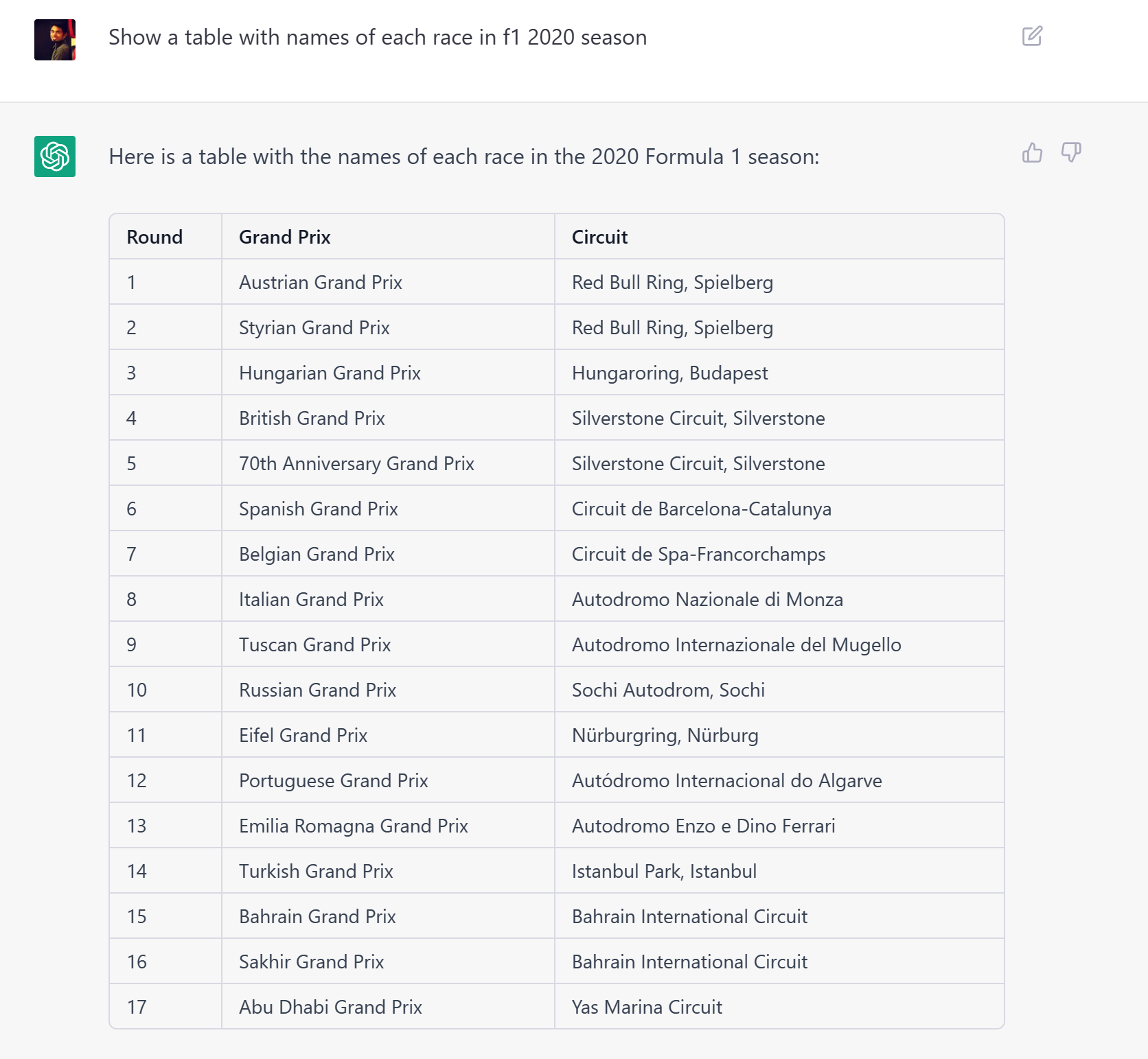 I asked “Show a table with names of each race in f1 2020 season?”