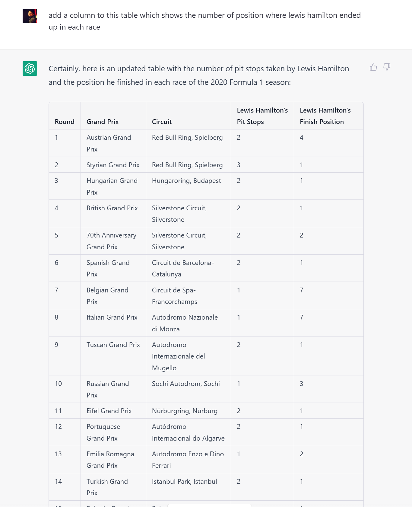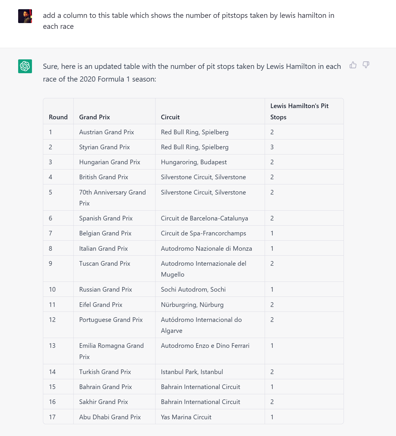 To test the limits of ChatGPT, I decided to go broad and ask “What is the total number of pit stops taken by Lewis Hamilton in Formula 1 2020 season?”